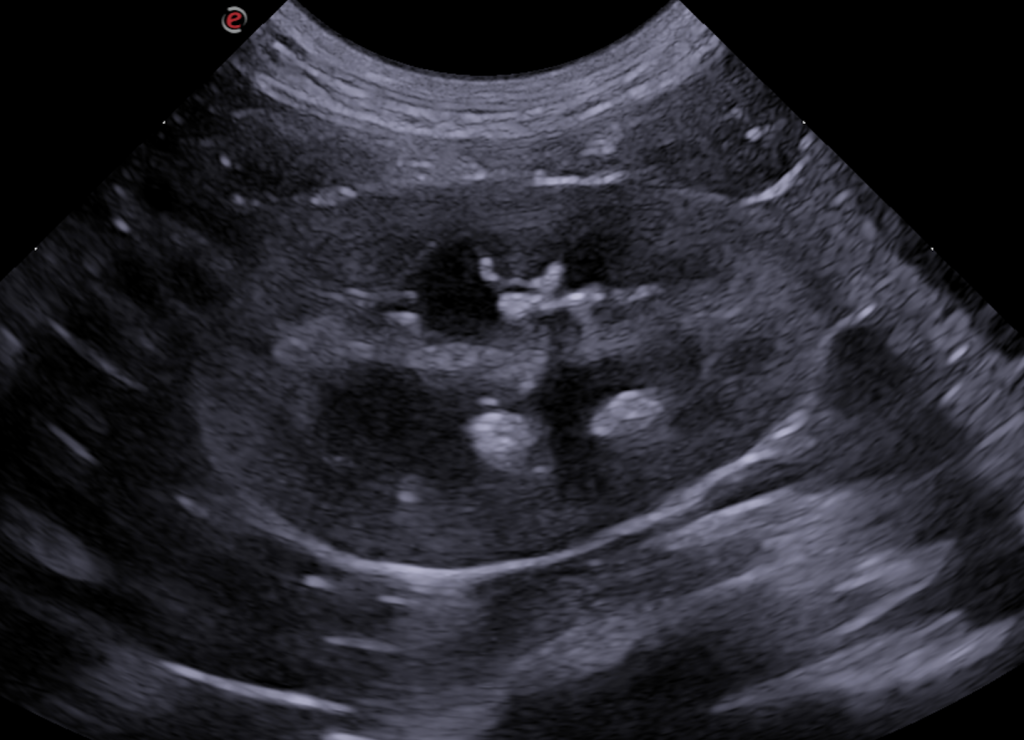 - Ambos riñones presentan estructuras redondeadas, de 1-4 mm, con superficie hiperecogénica y sombra acústica distal asociada (cálculo), en los divertículos renales. Se observa una mínima distensión de la pelvis renal (2 mm)