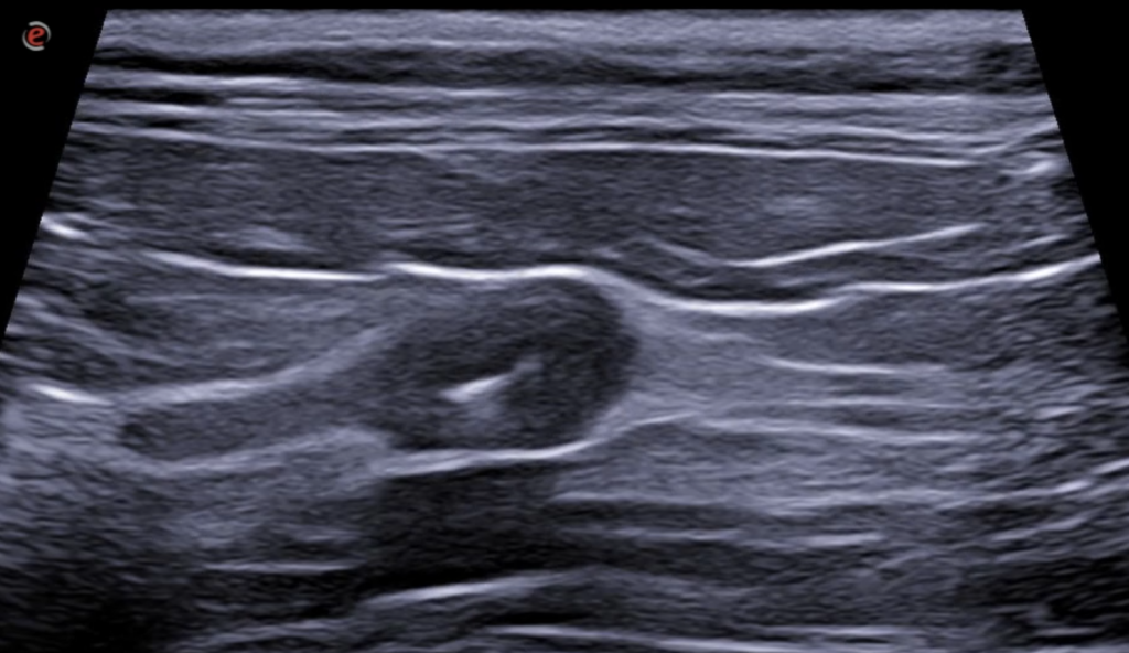 - El ureter izquierdo está ligeramente distendido y presenta en todo su recorrido la pared engrosada, observándose aproximadamente a 4 cm de su inicio, una engrosamiento marcado de su pared de forma concéntrica y circunferencial, observándose una pared hipoecogénica de 2 mm de grosor. En su interior, hay una estructura similar a la descrito en ambos riñones (cálculo), de 1.7 mm de diámetro. El ureter distalmente disminuye abruptamente de tamaño y se continúa de forma normal hasta la unión ureterovesical. El peritoneo de alrededor del ureter se aprecia hiperecogénico en todo su recorrido.